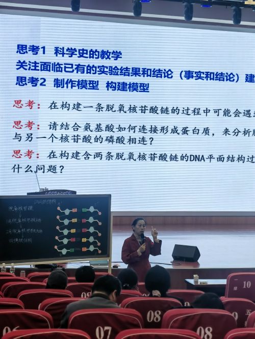 兩節(jié)課的大單元情境為遺傳物質(zhì)探索發(fā)現(xiàn)史。王旭芳老師通過引導(dǎo)學(xué)生對(duì)經(jīng)典實(shí)驗(yàn)的分析,重現(xiàn)科學(xué)家研究的過程、方法、現(xiàn)象和結(jié)果,構(gòu)建“核酸是生物體的遺傳物質(zhì)”這一概念。王老師從已知的事實(shí)、結(jié)論入手,引導(dǎo)學(xué)生“像科學(xué)家一樣去思考”,理清每個(gè)實(shí)驗(yàn)的科學(xué)思維及實(shí)驗(yàn)之間緊密的邏輯關(guān)系,形成對(duì)遺傳物質(zhì)的本質(zhì)的完整認(rèn)識(shí),培養(yǎng)學(xué)生科學(xué)思維和科學(xué)探究能力。劉洋老師以DNA分子雙螺旋結(jié)構(gòu)模型構(gòu)建過程資料為主線,帶領(lǐng)學(xué)生探索科學(xué)的本質(zhì),體驗(yàn)科學(xué)研究的方法。劉老師引導(dǎo)學(xué)生以DNA的化學(xué)組成知識(shí)為基礎(chǔ),通過資料分析,按照從簡單到復(fù)雜的認(rèn)知?dú)v程,自主完成DNA分子結(jié)構(gòu)模型的構(gòu)建,在螺旋上升的邏輯思維中動(dòng)手、動(dòng)腦、協(xié)作,在試錯(cuò)、糾錯(cuò)的過程中,加深認(rèn)識(shí),提升能力,領(lǐng)悟探究精神。