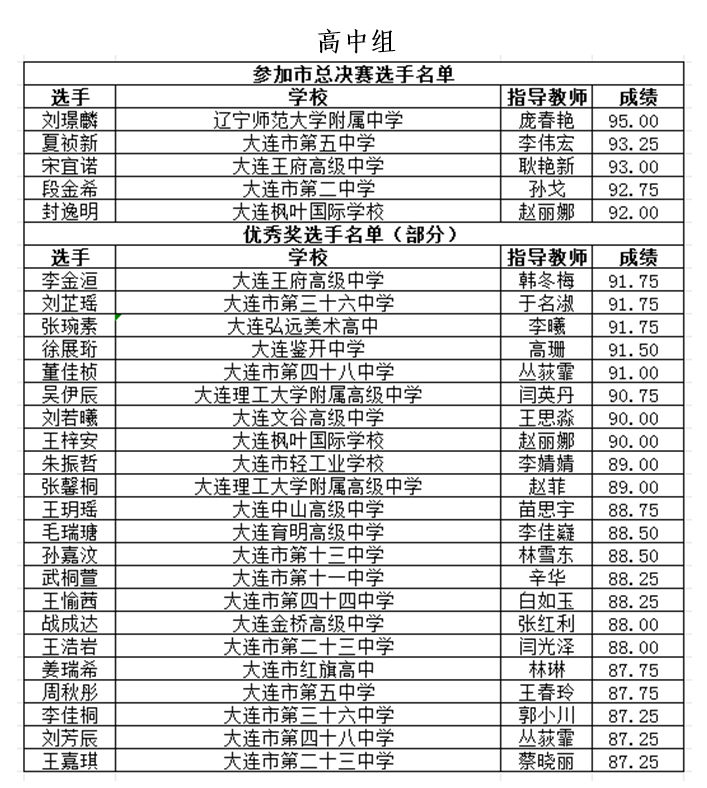大連市第二十七屆"楓葉杯"演講比賽(小學(xué)、初中、高中組)已經(jīng)圓滿落下帷幕。入圍復(fù)賽的選手獲得"優(yōu)秀獎"。小學(xué)、初中、高中組前五名選手入圍總決賽。現(xiàn)將各組復(fù)賽排名前30%的選手成績公布如下: