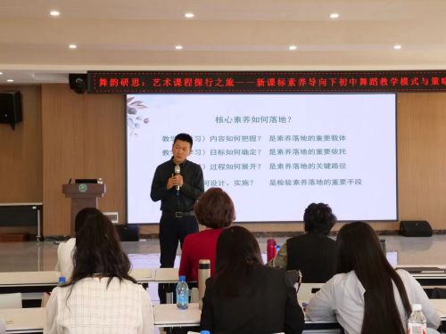 最后,薛金老師結(jié)合本次教研活動,從舞蹈的課程內(nèi)容、學(xué)業(yè)要求、教學(xué)策略建議、評價建議等方面作了題為《新課標(biāo)素養(yǎng)導(dǎo)向下的初中舞蹈有效教學(xué)評價》