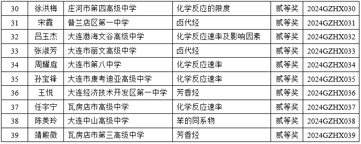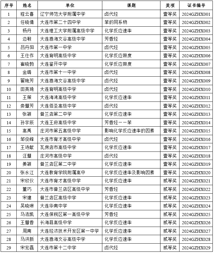 2024年大連市普通高中化學(xué)學(xué)科優(yōu)質(zhì)課評比工作接近尾聲,根據(jù)公平、公正、公開的原則,嚴(yán)格按照《大連教育學(xué)院學(xué)科教學(xué)評優(yōu)活動管理辦法(試行)》的要求和評委評審的成績排序,并報(bào)部門領(lǐng)導(dǎo)審查,獲獎名單如下: