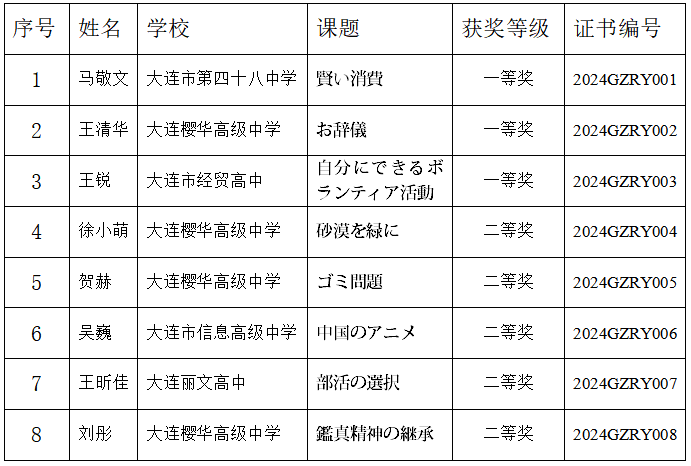 2024年度大連市高中日語優(yōu)質(zhì)課評選工作接近尾聲,根據(jù)公平、公正、公開的原則,嚴格按照線上分組封閉打分的成績排序,并報部門領(lǐng)導(dǎo)審查,現(xiàn)將獲獎人員名單公示如下: