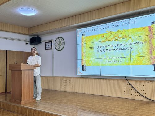 此次沉浸周活動主要有五項內(nèi)容:首先,楊老師在和學(xué)校領(lǐng)導(dǎo)座談過程中了解學(xué)科課程建設(shè)情況,提高“雙新”“雙減”落實實效。全面了解本校的書法學(xué)科課程設(shè)置及教學(xué)進度安排、“零起點”教學(xué)、學(xué)科作業(yè)、學(xué)科實踐活動等基本情況,并給予指導(dǎo)。并在座談和聽課過程中了解了冷冉“情·知教學(xué)”實踐情況。調(diào)研之后楊老師陸續(xù)聽取了9節(jié)書法老師的課堂教學(xué),每位老師對自己的課進行自我剖析,楊冬老師對9位老師的書法課堂教學(xué)進行了中肯的點評,還對書法老師在課堂教學(xué)中遇到的問題進行了答疑解惑。接下來,楊老師對學(xué)校書法學(xué)科校本研修活動進行指導(dǎo),對實驗小學(xué)的書法社團活動進行指導(dǎo),針對書法工作的現(xiàn)狀與學(xué)校領(lǐng)導(dǎo)以及書法教師提出了建設(shè)性建議,并寄予了殷切的希望。然后就是解決學(xué)科教學(xué)關(guān)鍵問題,助力學(xué)科教師隊伍建設(shè)。依據(jù)課堂教學(xué)和師生寫字亟待解決的問題,楊老師為瓦房店市實驗小學(xué)全體教師做了“核心素養(yǎng)下的小學(xué)寫字教學(xué)應(yīng)注意的若干問題及對策”專題講座。他的講座理論聯(lián)系實際,讓大家受益匪淺。最后,楊老師就本次活動進行小結(jié),并提出下一步的工作要求。