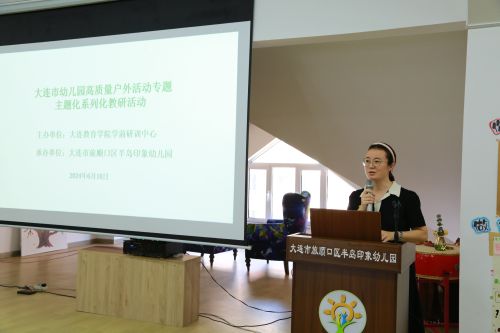 為進一步指導全市幼兒園高質(zhì)量開展戶外活動研究,推進旅順口區(qū)“一院兩區(qū)”教育戰(zhàn)略合作,加強園際跨區(qū)域?qū)W習交流,促進區(qū)域?qū)W前保育教育質(zhì)量提升,6月18日,由大連教育學院學前研訓中心組織的“大連市幼兒園高質(zhì)量戶外活動主題化系列化教研活動”在旅順半島印象幼兒園召開,同時面向全市幼兒園教師線上直播。學前研訓中心主任茅茵、旅順教師進修學校副校長唐琦、旅順教育局學前教育科科長趙俊楠、市區(qū)相關(guān)教研員以及66所高質(zhì)量戶外活動專題組負責人和教師代表80余人參加線下現(xiàn)場活動,全市幼兒園教師共計2000余人參加線上直播活動。此次教研活動由學前研訓中心朱璟老師組織。