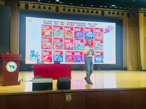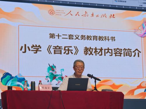 培訓活動由藝體勞研訓中心小學音樂教研員薛金主持,由人民教育出版社音樂教材執(zhí)行主編周海宏老師主講。培訓中,周老師梳理了人教新版音樂教材的知識體系和編寫脈絡,從美育的意義與功能的角度闡述了當下中小學音樂教育教學中應遵循的方向和實踐原則。同時結合一年級新教材,從單元教學設計、情境創(chuàng)設、樂譜識讀等方面,為參會教師呈現了經典的案例與實踐路徑。