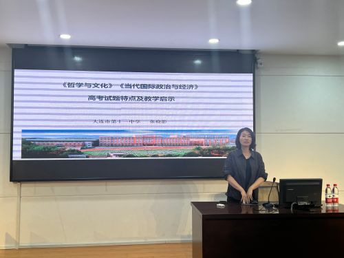 活動的主題是主要有三項內(nèi)容。首先由期末試卷命題人之一——大連市第八中學(xué)吳頔老師做期末試卷及成績分析。吳老師從試卷結(jié)構(gòu)、試題特點、考查載體、考查內(nèi)容、考查要求和評估難度等方面對重點題目進行具體分析,尤其對主觀題運用“問題邏輯可視化、知識邏輯可視化、答案邏輯可視化”的方法進行解析,使老師們對主觀題的理解更加清晰透徹,同時還從教與學(xué)的角度提出了下一步教學(xué)建議和方法。其次是大連市海灣高中馬麗平老師對2024年遼寧高考思想政治學(xué)科試卷題進行了解讀,并提出了教學(xué)啟示。通過與近兩年遼寧政治卷的對比,馬老師分析了今年試卷的總體特點、知識分布和難易程度,結(jié)合時政熱點和教材知識重點分析了學(xué)生們的易錯題目,結(jié)合多道高考真題總結(jié)了非“為什么”類考題的意義類語言表達特點,令老師們深受啟發(fā)。再次由大連市第十一中學(xué)張曉影老師總結(jié)了必修四《哲學(xué)與文化》及選必一《當(dāng)代國際政治與經(jīng)濟》教材的高考命題特點及教學(xué)啟示。張老師詳細(xì)梳理了2022-2024年遼寧高考政治卷中內(nèi)容涉及到這兩本教材的試題,從考查特點、問題設(shè)置、對接課標(biāo)與教材等方面進行了詳盡解讀,總結(jié)了命題規(guī)律和考查方向,并提出了落實課標(biāo)教學(xué)建議的行動策略,為高二新學(xué)期的授課提供了有效指導(dǎo)。