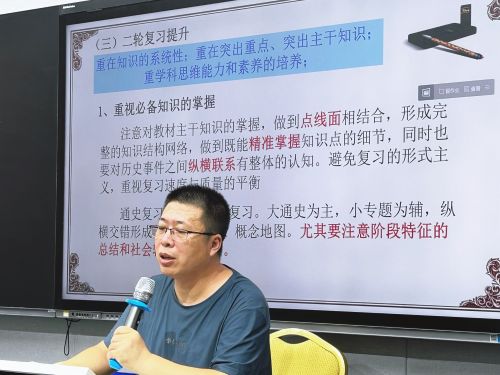 會議第一項(xiàng)內(nèi)容由莊河高級中學(xué)高振峰老師為大家介紹2024年備考經(jīng)驗(yàn)。高老師強(qiáng)調(diào):教研是教師成長的捷徑。上一個(gè)教學(xué)年度“三省四市高考研討會(哈爾濱)”“說命高考題大賽暨一輪復(fù)習(xí)研討會(鳳城)”“二輪復(fù)習(xí)備考會(丹東)”“揭榜掛帥課”等省市教研活動(dòng),保障了整個(gè)高三階段復(fù)習(xí)的規(guī)范、有序、高效。莊河高中歷史組依據(jù)國家考試中心“一核四層四翼”大方向,結(jié)合本校教學(xué)實(shí)際,探索了具有本校特色的復(fù)習(xí)方法,2024年高考?xì)v史學(xué)科獲得佳績。
