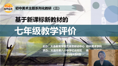 9月5日,大連市初中美術(shù)學(xué)科開展了“基于新課標(biāo)新教材的七年級教學(xué)評價(jià)”主題教研活動。線下會場在大連市第八十中學(xué)億達(dá)校區(qū),各區(qū)市縣初中美術(shù)研訓(xùn)教師及一線美術(shù)教師40人參會,線上同步開通鵝直播,觀摩人數(shù)200余人。