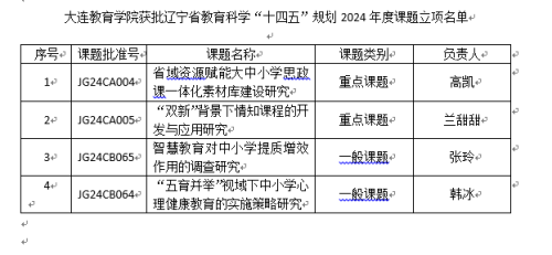 近日,遼寧省教育科學(xué)規(guī)劃領(lǐng)導(dǎo)小組辦公室公布了遼寧省教育科學(xué)規(guī)劃“十四五”2024年度立項(xiàng)課題名單,大連教育學(xué)院獲批4項(xiàng),其中重點(diǎn)課題2項(xiàng),一般課題2項(xiàng)。