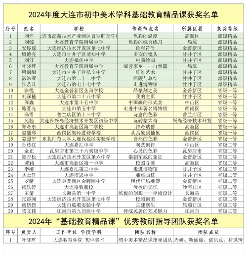 近日,教育部網(wǎng)站公示2024年“基礎(chǔ)教育精品課”遴選“部級精品課”名單,大連市初中美術(shù)教師團隊再獲佳績,9人獲評“部級精品課”。另有9人獲省級一等獎,10人獲省級二等獎,2人課獲省級三等獎,獲獎教師覆蓋大連市全部區(qū)市縣。