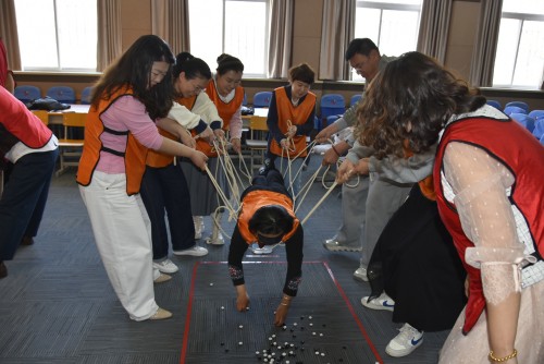在“大風(fēng)吹”“接龍拍拍”“桃花朵朵開(kāi)”等活動(dòng)中,老師們愉悅成組。主題活動(dòng)“渾水摸魚”中,各小組齊心協(xié)力、集思廣益,老教師自發(fā)地織起漁網(wǎng),托起年輕教師,深刻體會(huì)著分工合作、相互支持的溫暖,感受著薪火相傳的美好。