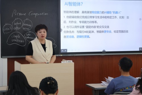 在“設(shè)計(jì)解讀”環(huán)節(jié),市英語教研員孫越以《讀后續(xù)寫系統(tǒng)設(shè)計(jì)》為主題開展講座,強(qiáng)調(diào)讀后續(xù)寫教學(xué)需實(shí)現(xiàn)“綜合與專項(xiàng)”“課內(nèi)與課外”“精寫與泛寫”的三維融合,構(gòu)建立體化訓(xùn)練體系,并組織老師就AI智能體在寫作中的場景化應(yīng)用開展交流。