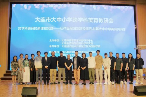 6月11日下午,大連市高、初、小三個學段美術學科在大連經(jīng)濟技術開發(fā)區(qū)紅星海國際學校聯(lián)合召開大中小學跨學科美育教研會,主題為“跨學科美育的新課程實踐——從作品展演到路徑探尋,共筑大中小學美育共同體”。大連教育學院藝體勞研訓中心、大連經(jīng)濟技術開發(fā)區(qū)紅星海國際學校、遼寧師范大學美術學院、大連大學美術學院、大連藝術學院美術學院、魯迅美術學院視覺傳達設計學院、大連理工大學建筑與藝術學院等高校專家教授、市區(qū)兩級美術教研員、大連市美術骨干教師、金普新區(qū)全體教師共計400余人參會,線上參會千余人。