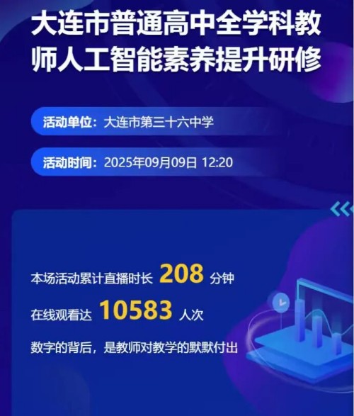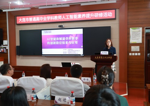 近日,“大連市普通高中全學(xué)科教師人工智能素養(yǎng)提升研修活動(dòng)”在大連市第三十六中學(xué)圓滿舉辦。大連教育學(xué)院副院長(zhǎng)趙妤婕出席活動(dòng)并致辭。本次活動(dòng)由大連教育學(xué)院主辦,采用線下與線上相結(jié)合的研修模式,吸引了超1萬(wàn)人次在線觀看。